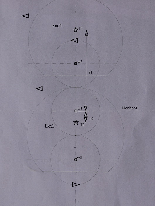 V ose kola w2(w3) je potom upevněn excentricky setrvačník, který kopíruje pohyb w2(w3). Princip funkce tohoto stroje je v tom, že zatímco w2 oběhne kolem dokola w1 jednou, tak excentr1(2), napojený přímo na osu w2(w3), se během tohoto oběhu otočí dvakrát! Na skice je nakreslený v poloze jak v horní tak dolní úvrati. Těžiště excentrů je označeno hvězdičkou. Tady už vidíme, že je mezi nimi velký rozdíl. Jsou to parametry r1 a r2. Dosadíme-li je do rovnic pro výpočet odstředivých sil, dostaneme značný přebytek sil v horní oproti dolní úvrati. Ve spodní úvrati má r2 sice zápornou hodnotu, ale nemusí to tak nutně být. Stačí posunout těžiště excentrů směrem nahoru a r2 může být nulové nebo dokonce kladné. To se dá jednoduše provést tak, že do otvorů v horní části excentrů zašroubujete třeba ocelové šrouby. Tím se těžiště posune výrazně nahoru.